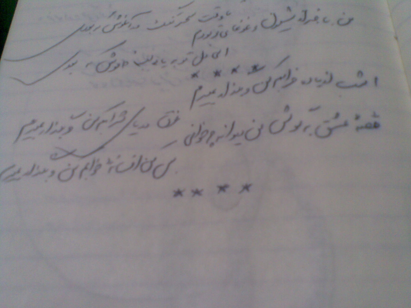جلوی آینه هی به خودش چشمک میزنه و واسه خودش بوس می فرسته وقتی داره خط چشم می کشه زیر چشمی خودش رو نگاه میکنه و جای یه نفر رو پشت سرش خالی احساس می کنه اونی که وقتی داره  خط چشم می کشه بیاد اذیتش کنه و پشت گردنش رو ببوسه.  وقتی میخواد ریمل بزنه به دهن باز مونده اش بخنده و مسخره اش کنه و زن مو خرمایی نتونه ریمل بزنه و هی غر بزنه . جای اونی که همیشه قبل از رژ لب زدن یه بوس طلب میکنه امروز قبل از آرایش توی خونه خالیه.  زن مو خرمایی خبر داره امروز عصر یه دعوای گنده در راهه واسه همین آرایش قبل از طوفانش رو کرده و منتظر نشسته.  سخته آدمها اتفاقات روزهای هفته رو بدونند.  واسه همینه خدا آدمها رو از سرنوشتشون بی خبر گذاشته.  #@#@#@#@ دست آبجی کوچیکه درد نکنه ،امروز آمد موهامو واسم رنگ کرد.  یعنی اینقده این مو خوشرنگ شده که خودم عاشق خودم شدم.  هی به خودم متلک میگم. واسه خودم نگرانم. ولی قربون این آبجی برم با این اعصاب سه در چهارش. یعنی خدایی این آبجی باید میرفت آرایشگر میشد.  دهن همه مشتری هاش سرویس بود. وای آبچی کوچیکه یادم رفت میخواستی بری ماچت کنم. الان ماچ راه دورم را پذیرا باش . تجدید خاطره.  عکس های شمال لبخند به لبم میاره.دلم رو می لرزونه. گلوم رو سنگین می کنه. چشمم رو گرم میکنه تار میکنه بعد با اولین قطره ی اشک آروم میشم. آروم  ِ آروم این عکس سیاه لبریز از خاطرات سبز و سفید.  توی کابین تلکابین که بودیم اینقده با هم سفرها گفتیم و خندیدیم که اون بالا دستشویمون گرفته بود داشتیم میترکیدیم.  زیباترین منظره وجود یه خونه ی وسط مزرعه ی چایی بود که یه ماشین قدیمی ابی رنگ داشت با دوتا اسب مشکی . این خونه اینقده رویایی بود که هنوز که هنوزه توی رویاهام دوست دارم یه خونه اون مدلی داشته باشم وسط مزرعه ی چایی بین دوتا کوه . #@#@#@#@#@#@ یه زن وقتی آروم و بیصدا میره یه گوشه از تخت کز میکنه پاهاشو جمع میکنه توی شکمش و سرشو میذاره روی پاهاش و خاطراتش رو مرور میکنه ،یعنی خیلی دلش گرفته و دلتنگه.  الان اونجوریم.  صدايت در پيغامگيرِ تلفن ات مهربان است یهویی چشمم خورد به دفتر قرمزم که خاطرات اوایل ازدواجم و وقتی که توی غربت زندگی میکردیم توش مینوشتم . دیگه بی خیال کتابها شدم و نشستم به مرور خاطرات.  وای مدل به مدل اسم شوشو بود که هی نوشته بودم هی با خودکار های رنگ رنگی رنگ کرده بودم. هی گل کشیده بودم واسش شعر نوشته بودم.  اصلا یه هنرمند تمام عیار بودم من واسه خودم.  یه جا هم مجبورش کرده بودم واسم شعر بنویسم.  اون شب رو دقیق یادمه. هی گفت من شعر عاشقانه بلد نیستم ،گفتم هرچی بلدی بنویس، بعد نشست هرچی شعر سربازی ننه من غریبم بلد بود نوشت بعدش کلی تو سر و کله اش زدم. :))))) ایننم نوشته های شوشو بعد وسط دفتره اینو پیدا کردم  واسه اون دوران طفولیت بود که با کارت اینترنت میومدیم نت  بعد من میرفتم از این جینگیل مستوناش رو میخریدم. یعنی اینقده ذوق و هنر در وجودم نهفته بوده و خودم خبر نداشتم [نیشخند] $#$#$#$#$#$#$#$ دیشب از اون شبهایی بود با شوشویی افتاده بودیم به حرف زدن.  دوتایی جلوی شومینه ی سالن دراز کشیده بودیم از همه جا حرف زدیم بعد یه وقت به ساعت نگاه کردیم دیدیم  2 نصف شبه و هنوز یه عالمه داستان نیمه کاره داریم.  بعد از اون دعوا و دلخوری ها این حرف زدن ها باعث بر طرف شدن کدورتها میشه.  شوشو خوب میدونه چطوری منو خر کنه میدونه یه شب که تا صبح فقط بشینه واسم حرف بزنه از فرداش همون چیزی میشه که خودش میخواد ...منم همون چیزی میشم که اون میخواد.  چون میخوام زندگی کنم و مهمتر این که دوستش دارم.  $#$#$#$#$#$#$ دوستانی که پرسیده بودند آیا شوشو اینجا رو میخونه یا نه؟ شوشو آدرس اینجا رو داره ولی اصلا بروز نمیده که اینجا رو میخونه . چیزهایی که اینجا مینویسم بین من و اون مخفی نیست. حتی اگه حرفی واسه خانواده اش یا خانواده ام باشه.  حتی اگه اینجا بنویسم از شوشو متنفرم مطمئن باشید شب قبلش تو گوش خودش داد زدم که ازش متنفرم و چرا ازش متنفرم اگه بیام از عشقم بنویسم قبلش عشقم رو بهش ثابت کردم. پس بدون ه